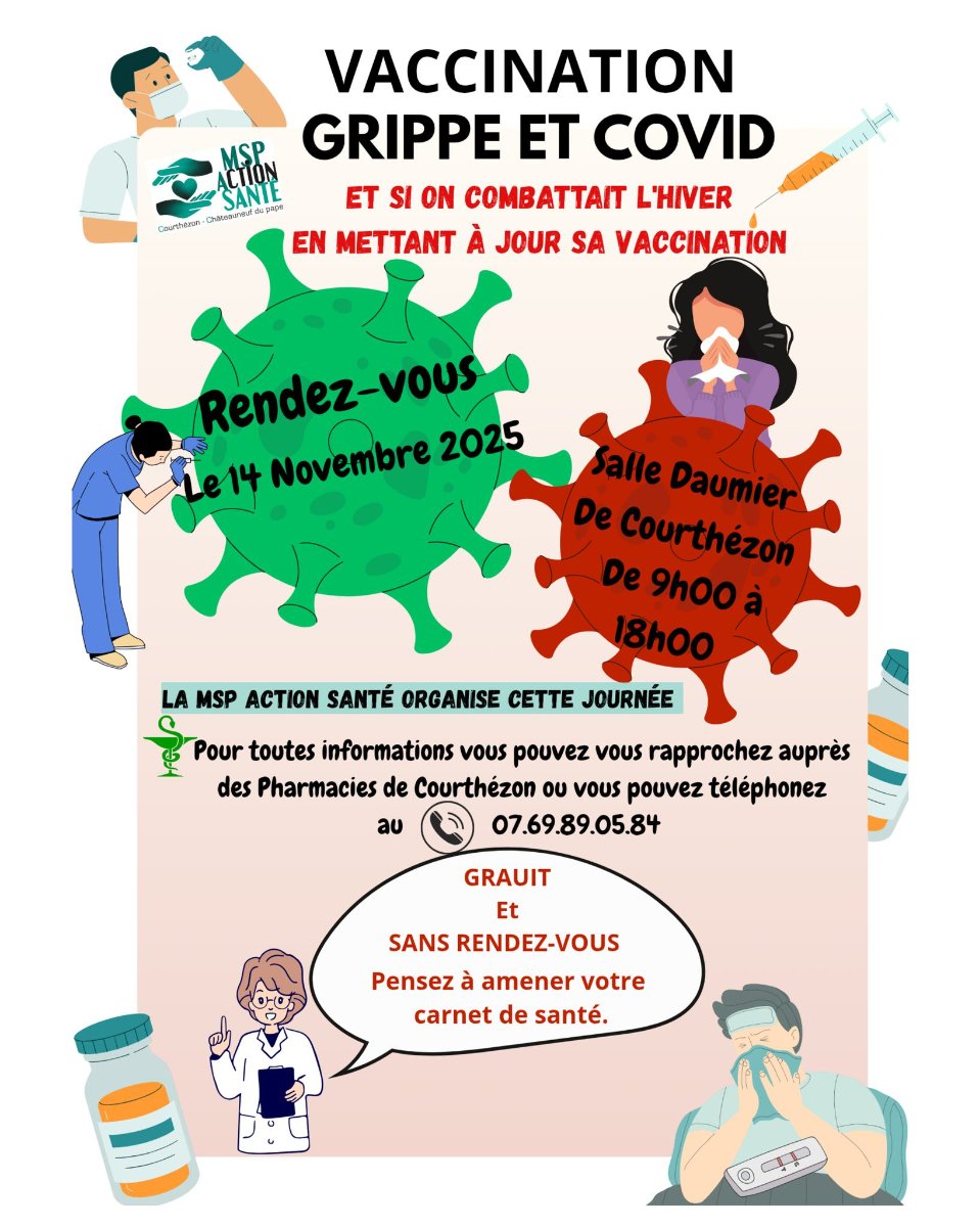 La Maison de Santé Pluridisciplinaire Action Santé vous propose une mise à jour de vos vaccins grippe et covid, gratuitement et sans rendez-vous le vendredi 14 novembre de 9h à 18h, à la Salle Daumier.