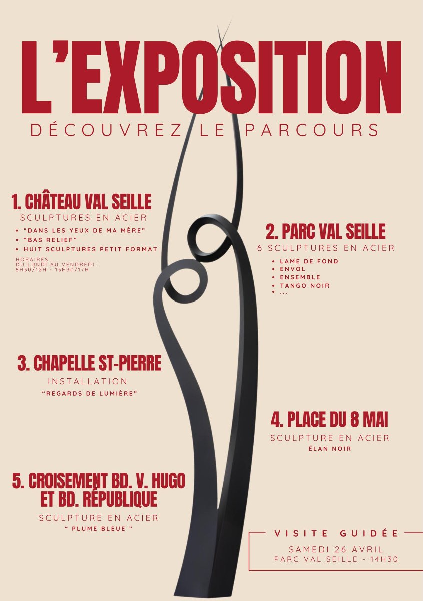 Venez découvrir les formes sobres et épurées des œuvres de Francis Guerrier pendant six semaines dans les plus beaux endroits de la ville. Vernissage le 18 avril à 18h30 au pied du majestueux château Val Seille !