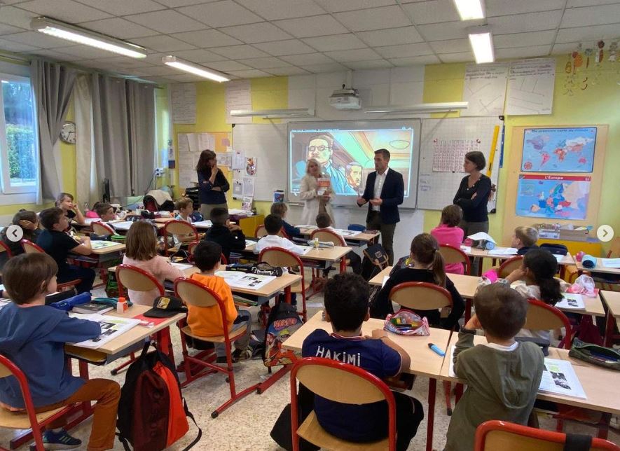M.Le Maire et Mme Sabbatini élue aux affaires scolaires ont procédé à la distribution dans les écoles de la commune, un moment fort pour nos écoliers !