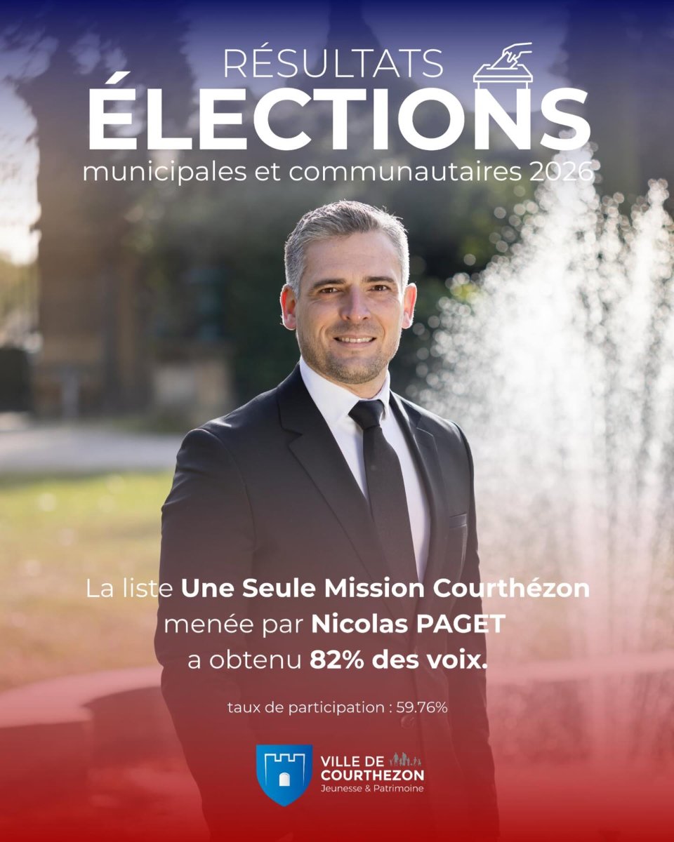 Élections municipales et communautaires 2026 : le résultat La liste Une seule mission Courthézon menée par M. Nicolas Paget est élue avec 82% des voix.