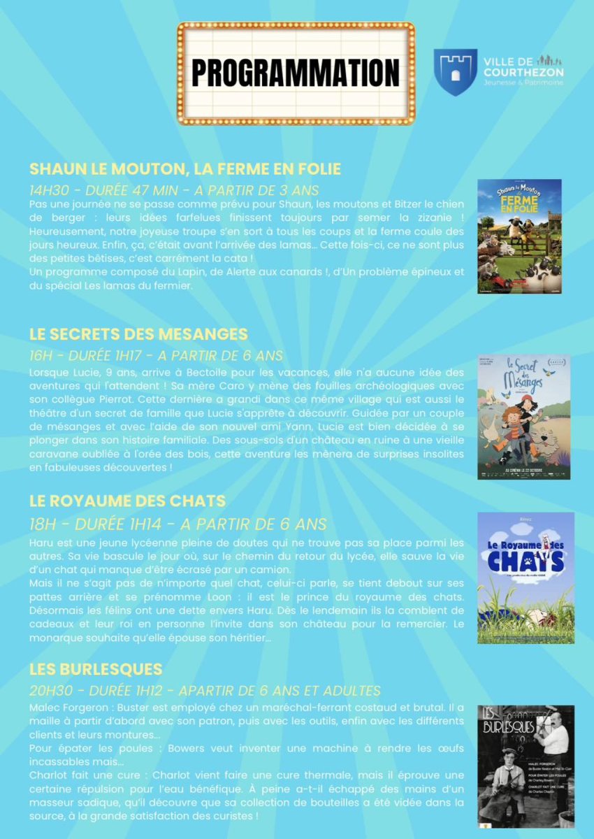 « Shaun Le Mouton, la ferme en folie » donnera le coup d’envoi du festival à 14h30, s’en suivra « Le secret des Mésanges » à 16h et « Le Royaume des Chats » à 18h et pour conclure cette édition 2025, rendez-vous à 20h30 avec la diffusion « Les Burlesques » !