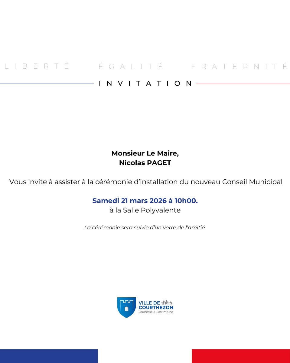 Courthézonnaises, Courthézonnais, M. le Maire Nicolas PAGET vous invite à assister à la cérémonie d’installation du nouveau Conseil Municipal, samedi 21 mars – 10h à la Salle Polyvalente. La cérémonie sera suivie d’un verre de l’amitié.