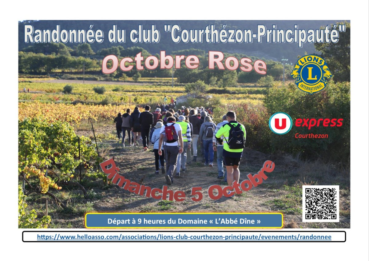 Le Lions club Courthézon-Principauté organise sa randonnée pour Octobre Rose Renseignements et informations sur le visuel.