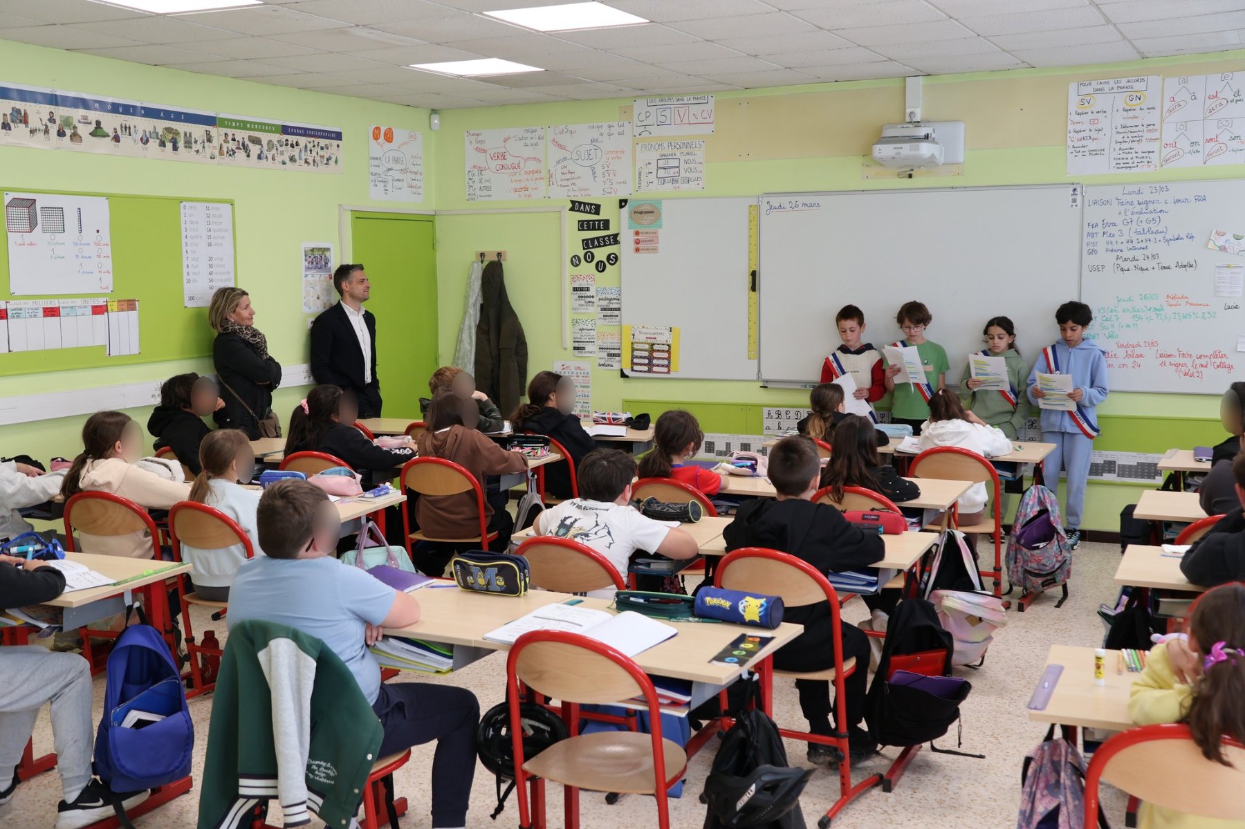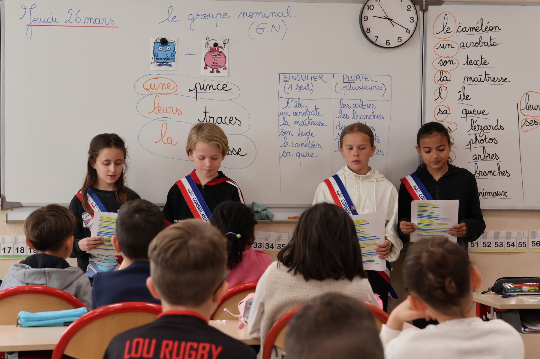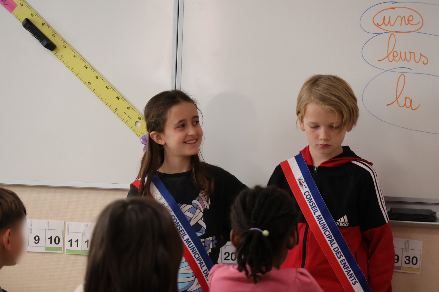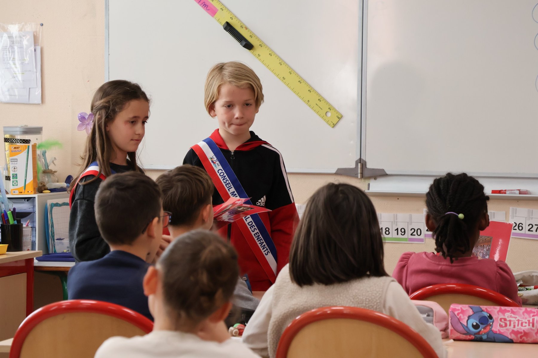 Après leur passage à l’école Notre-Dame, les jeunes élus, accompagnés par M. le Maire et Mme. Courrieu, élue en charge de la vie démocratique , se sont rendus dans les classes du CE1 au CM2 de l’école Jean Vilar.