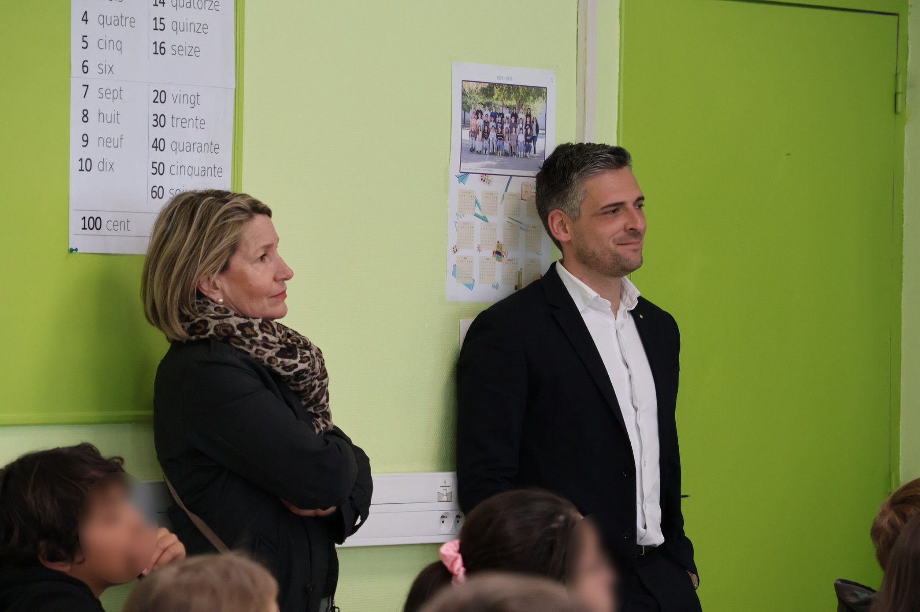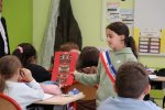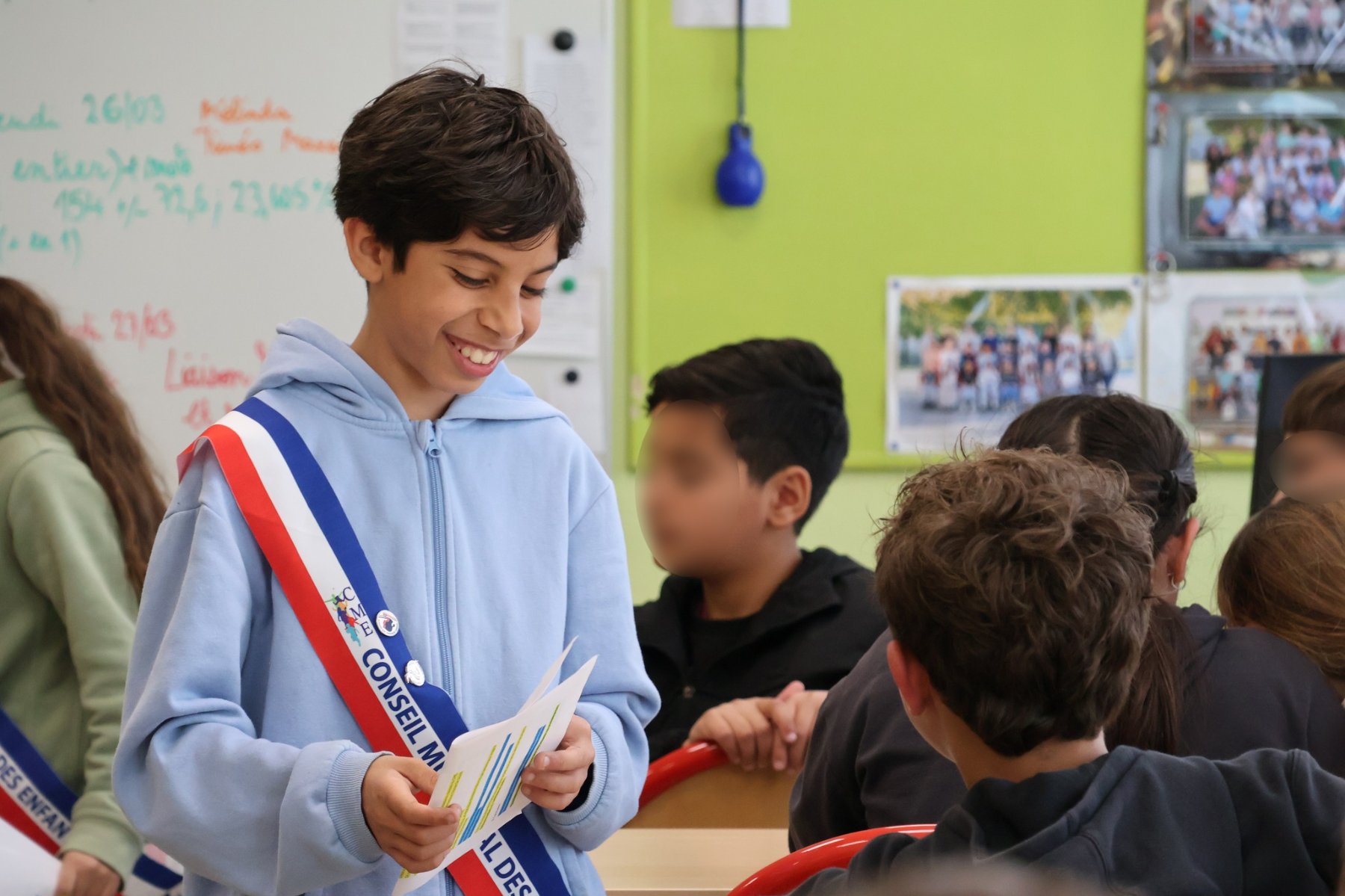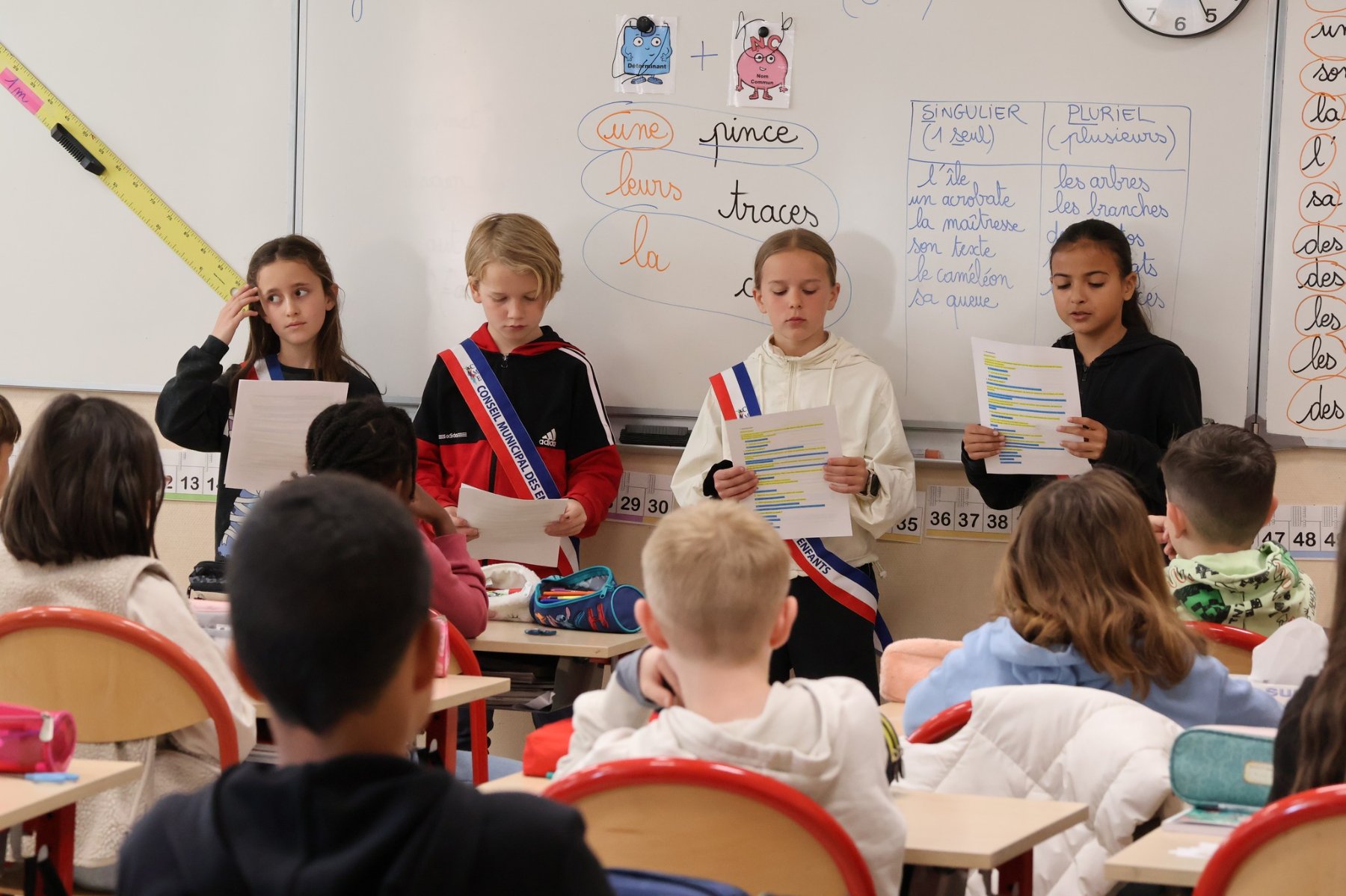 Après leur passage à l’école Notre-Dame, les jeunes élus, accompagnés par M. le Maire et Mme. Courrieu, élue en charge de la vie démocratique , se sont rendus dans les classes du CE1 au CM2 de l’école Jean Vilar.